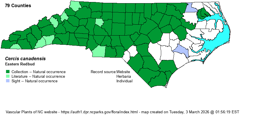 | Identification | This is one of the easiest plants in the state to identify, at least in the growing season. This is a small to rarely medium-sized deciduous tree, growing mostly to about 25-40 feet tall. The fairly large, heart-shaped leaves to about 4 inches long are essentially unique, at least among native trees. Also, the small clusters of bright rose to pink flowers and buds, growing closely along the stems, are visible before the leaves emerge, marking a tree as a Redbud at long distances, even from a speeding vehicle. | |