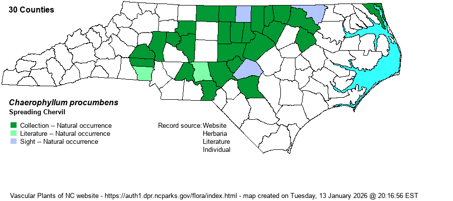 | Identification | This is a low-growing, leaning species with a weak stem, usually branched from the base, reaching to about 8-12 inches long at most. It has only a few alternate leaves, each one strongly bipinnately dissected into "lacy" segments, each lobe rounded and only 1/4-inch or less long and much narrower. In some leaf axils grow the small umbels on long stalks, with only 3-10 small white flowers in each umbel. In this species, the stem and leaves are glabrous or nearly so; the similar C. tainturieri is erect, much taller, has a quite hairy stem and leaves, and grows in disturbed soil of wooded margins, fields, and other similar places. | |