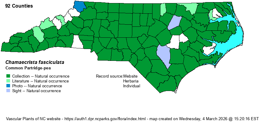 | Taxonomic Comments | In much of the 20th Century, the species was named as Cassia fasciculata, but essentially all references now consider it in the genus Chamaecrista. There are several varieties, and the one in NC is the nominate C. fasciculata var. fasciculata.