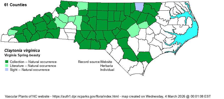 | Identification | This is a familiar spring ephemeral wildflower of the state's lower elevations, essentially below 3500 feet. It has a single stem, generally erect to leaning, but only about 6-8 inches tall, with only a few stem leaves. These are linear, about 3 inches long, opposite, but without a distinct petiole. In this species, the blade is narrow enough that the petiole is not clearly noticeable; in C. caroliniana, the leaves are lanceolate to elliptical, and the petiole is quite distinct from the leaf blade. Both species have a short raceme at the end of the stem, of 6-20 flowers, only a few in bloom at a time; each has white to light pink petals, with pink veins, that are elliptical and spreading, and the open flower is about 1-inch across, reasonably large for the small size of the plant. Both species grow in dense patches, and many a rich forest floor has one of these two species carpeting parts of the ground. However, for some odd reason, most of the western Piedmont is devoid of both of these species -- not for lack of trying to find them. | |