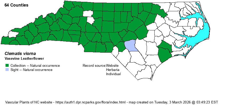 | Distribution | Note that Weakley (2024) has accepted the split of C. beadlei from this species; that species was formerly just named as Clematis species 9, by NatureServe. This new species is not scarce over the Piedmont, though is scarce in the upper Coastal Plain; however no specific details of range (i.e., counties) have been presented. As a result, the map below may well contain records just of this new species and thus be incomplete and "overstated".