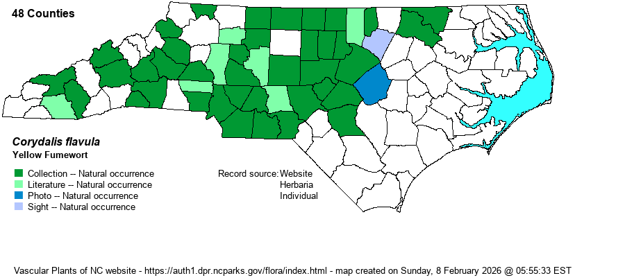 | Identification | This is a low-growing spring ephemeral wildflower, often growing in large patches. The stem is often branched near the ground and can be somewhat decumbent to erect, and it reaches only about 4 inches tall. The leaves are on long petioles and are alternate, along with basal; each blade is twice-branched, with very small, finger-like ultimate segments; each leaf is barely 3 inches long, counting the petiole. The bright yellow flowers are in short racemes of a few flowers each; each flower is horizontally facing, tubular, and about 1/3-inch long, with a spur in back. C. micrantha and C. halei are quite similar, but they have larger flowers, about 1/2-inch long, with a longer spur; they have fruits erect or ascending, whereas the fruits of C. flavula are drooping. The habitats of these are different, with C. flavula a plant of rich to moist floodplains and cove forests; C. micrantha grows in dry, rocky places, cliffs, and outcrops (over mafic or calcareous rocks), and C. halei grows only in the Coastal Plain and in sandy soil or roadsides and other clearings. C. flavula is locally numerous enough in some bottomlands that the bright yellow of the flowers is noticeable, even though each flower and each plant is quite small. As with many other low-growing native spring ephemerals, they must compete with exotics such as Microstegium vimineum and Stellaria media for valued space on the forest floor. | |