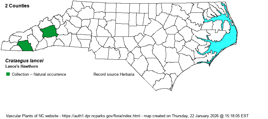 | Taxonomic Comments | Though this species was only described in 2008, and named for Ron Lance, who wrote the primarily hawthorn reference book in 2014, Weakley (2018) suggests that forms of it were included within the very broad C. flava in RAB (1968). As with C. flabellata, C. flava has now been split up into a number of “new” species and thus no longer exists. Not surprisingly, NatureServe has not yet given this taxon a Global Rank.
