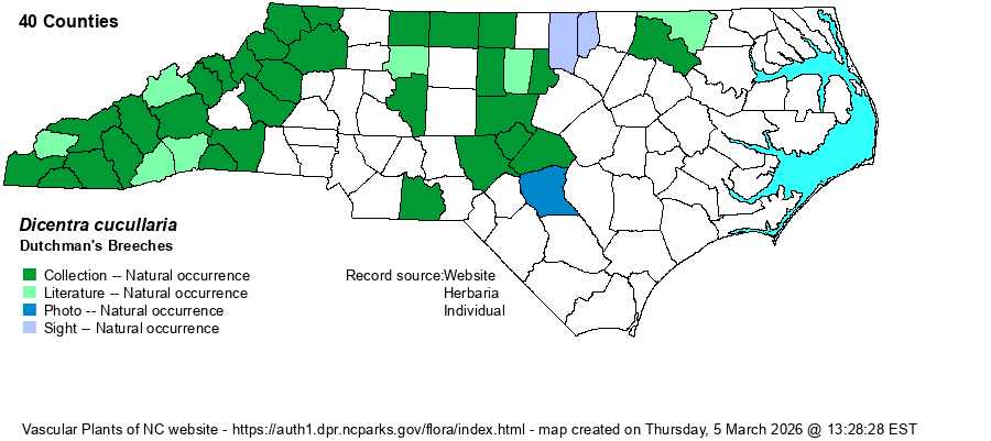 | Phenology | Blooms in March and April, and fruits in April and May. It blooms about two weeks earlier than does the very similar Squirrel Corn (D. canadensis) at the same location. | |