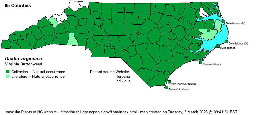 | Identification | This is a very familiar plant across the state, owing to its relative "large" flowers for a creeping plant. It has a decumbent to leaning stem, with many branches, to about 1 foot long. The opposite stem leaves are elliptical to oblanceolate, averaging about 2 inches long and 1/3-inch wide. The bright white flowers are mostly single in leaf axils, but they have a rather long tube and 4 spreading lobes, with the tube about 1/3-inch long and the spread flower about 1/2-inch across. It tends to grow in mats or large patches of uncountable plants, often decumbent. The flowers are somewhat large, and brighter white, than the similar Hexasepalum teres, which usually has smaller, pink flowers and almost always grows in dry or mesic soils and not in wetlands. In addition, D. virginiana has only 2 sepals (or rarely 4, but 2 are much different from the other 2) instead of 4 in the other species. For distinctions from the very similar D. harperi, see that species. | |