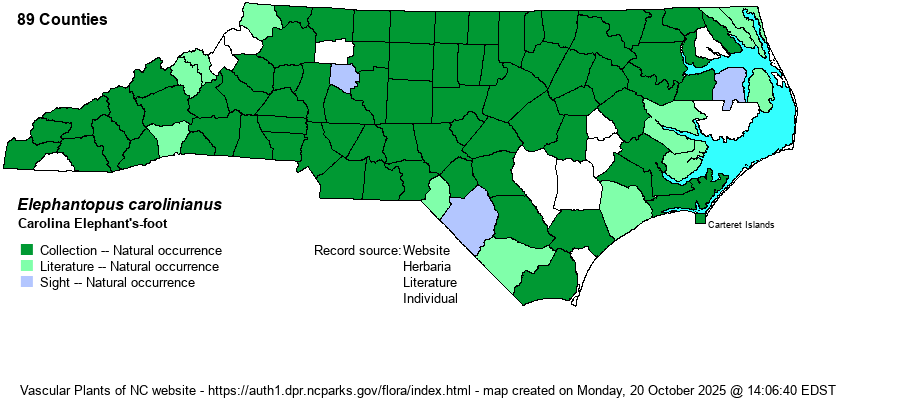 Identification | Elephant's-foots have a characteristic whorl of 3 triangular, leafy bracts immediately below the heads. This character separates Elephantopus from Vernonia, which has heads the same size and color (pink to purple). In most species, the bracts and heads sit atop long, nearly leafless, stems, but in this species there are well-developed stem leaves. Also, this species lacks the broad basal leaves that the other species have. | |