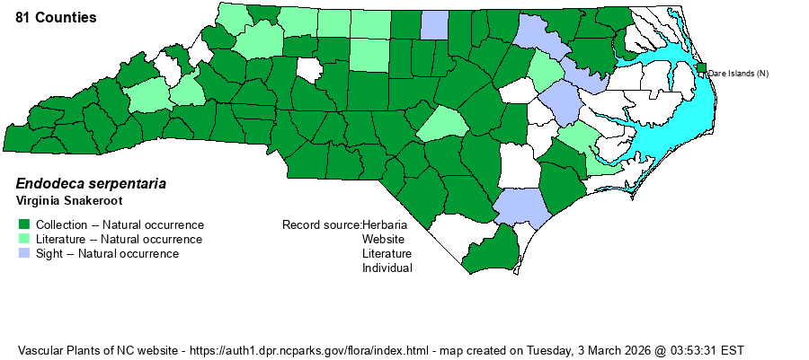 | Distribution | Present nearly statewide, but scarce to locally absent over much of the eastern third of the Coastal Plain. Just one reported location (Nags Head Woods, Outer Banks of Dare County) east of Gates, Chowan, and Jones counties.
