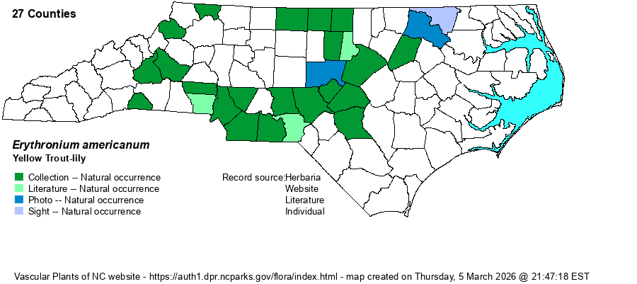 | Distribution | It has been 30+ years since Erythronium umbilicatum was described, split out of E. americanum. Nonetheless, the SERNEC database contains quite a few dozens of specimens that are still labeled as E. americanum that, based on geography and location within the county, may well refer to E. umbilicatum, the much more common of the two species in NC. Even some specimens at the NCU herbarium are suspect, but are included on the map below, until taxonomists there examine more closely their Erythronium specimens. In addition, the NCU counties listed as E. americanum in the SERNEC database seem to match the known distribution -- being a species primarily of the Piedmont, extreme upper Coastal Plain (at least along the Roanoke River and Cape Fear River), and perhaps sparingly in the Mountains (at least the northern Mountains). The website editors have also mapped records from other herbaria that specifically say "subsp. americanum". The map below is certainly incomplete, and it likely is present in much or most of the northwestern Piedmont and sparingly in the Mountains -- Weakley's (2022) map shows it as "rare" in that province.