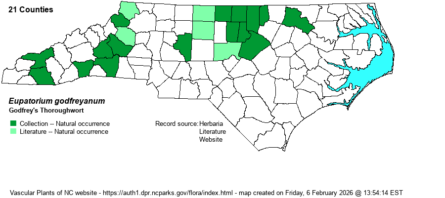 | Distribution | Low to middle elevations in the Mountains, and the northern half of the Piedmont, extending east to Halifax County. A record from Moore County is a misidentification, as is/was one from Wilson County (annotated by Sorrie in 2025 to E. cordigerum). Due to previous confusion between this species and Fernald's Thoroughwort (E. fernaldii), and the very closely related Vasey's Thoroughwort (E. vaseyi), all records need vetting.