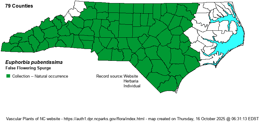 Identification | False Flowering Spurge is certainly closely related to Flowering Spurge (E. corollata) (which see), and not all authors agree that they represent distinct species. Both can have glabrous or pubescent stems, although Flowering Spurge is seldom so. E. pubentissima has shorter and narrower (and thus less showy) floral glands, and thus a flower is barely 1/6-inch across, stems no taller than 2 feet, and stems smooth to short-hairy. It has many fewer flowers per plant than does the quite showy E. corollata, its leaves are thin and green as opposed to thick, leathery, and dark green above in E. corollata, and it has mostly drooping leaves as opposed to somewhat ascending leaves in the other species. This species blooms considerably earlier -- late March to July as opposed to June to September in E. corollata. See other details in the key in Weakley (2018). Thankfully, each species is common, or reasonably so, in the western 3/4th of the state, and botanists should see them often, even if this species is somewhat unfamiliar to many owing to taxonomic issues in the past. | |