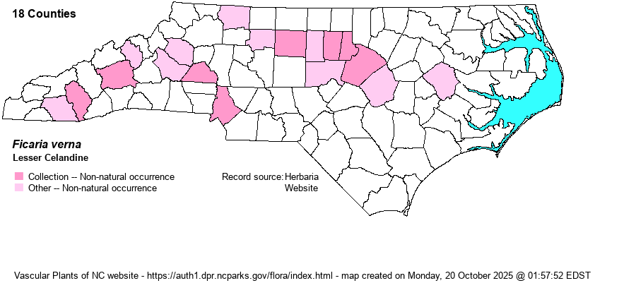 Taxonomic Comments | Also treated as Ranunculus ficaria. FNA disregards the infraspecific taxa as "impossible to distinguish." Weakley (2022) lists two subspecies -- the very common and increasing spp. calthifolia, and the scarce spp. ficariiformis, limited right now to the Piedmont. It has much smaller leaves and flowers than does calthifolia.