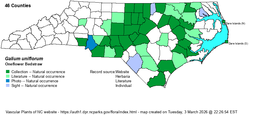 | Identification | This is a very slender and quite small Galium ranging only to about 8-10 inches tall, usually leaning and with a few branches. The stem is smooth, but the leaves are stiff, shiny, dark green, and evergreen. There are 4 leaves per whorl, each leaf being linear to narrowly oblanceolate, about 3/4-inch long but barely 1/8-inch wide. There are only a few tiny white flowers in the leaf axils, but quite conspicuous are the small but fleshy, black fruit; only this species and G. bermudense have fleshy fruit in the genus. As the species is evergreen, it can be spotted on a winter walk in a mixed pine-hardwood forest or in a bottomland forest. | |