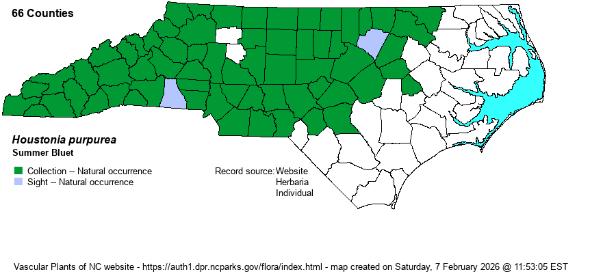 | Other Common Name(s) | Purple Bluet, Mountain Bluet, Woodland Bluet, Large Houstonia, Venus' Pride. Purple Bluet is often used, but the flowers of this species are usually white. | |