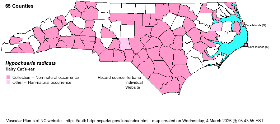 | Identification | Hairy Cat's-ear is often common enough that folks mistakenly call it "dandelion". Its leaves -- essentially a basal rosette -- are shallowly lobed and rough-hairy, not deeply lobed and smooth as in Common Dandelion (Taraxacum officinale); it leaves have a rounded tip, vs. an arrowhead or triangular tip of the leaves in that species. The heads of dandelion are much broader and more rounded on top. From Smooth Cat's-ear (H. glabra) it is best told by the rough hairy leaves (vs. smooth leaves in H. glabra). | |