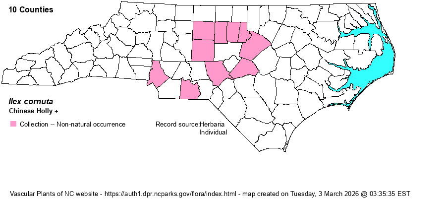 | Identification | This small tree has very thick, coriaceous leaves with sinuous margins. Most NC plants have a few tough, very sharp spines on the margins, but other plants have rather elliptical leaves without spines. The berries are bright red. Spiny plants may be confused with Ilex aquifolia -- not known to escape in NC, but that plant's leaves are much darker green and have more spines per leaf (twice or more). | |
