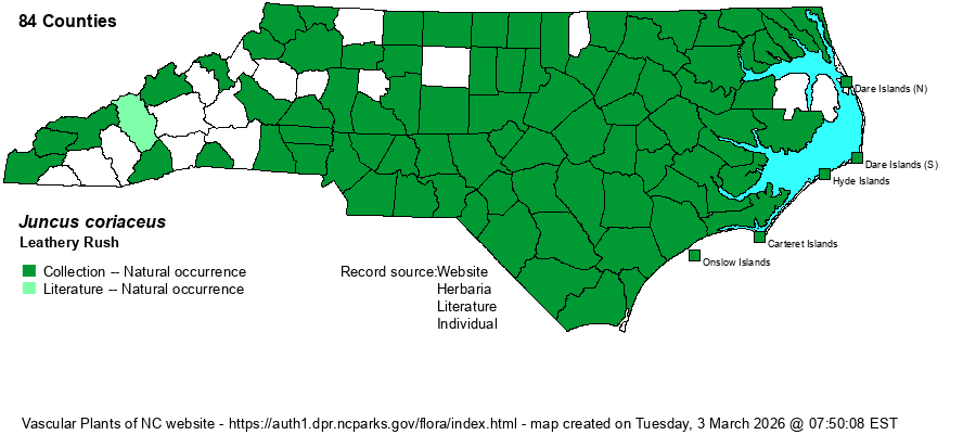 | Identification | Leathery Rush is much like the ubiquitous Soft Rush (J. effusus) in having the inflorescence appear to be lateral and well below the tip of the stem. However, the inflorescence is smaller and fewer-flowered, the capsules are more rounded (vs. subglobose at most), and the stems narrower and not as soft. | |