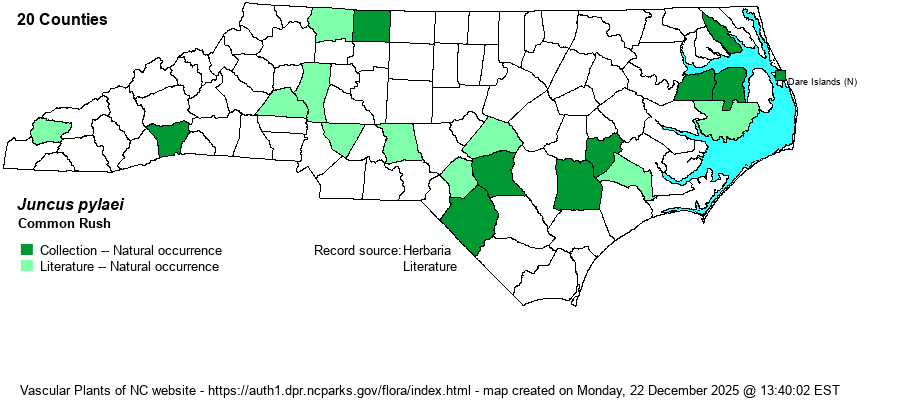 | Distribution | Mostly Coastal Plain, but also Stokes and Henderson counties. To date, only MICH and NCU herbaria have specimens labeled as Juncus pylaei. More records are expected to come to light as other herbaria annotate their specimens from J. "effusus". Weakley (2018) says "overlooked and probably more widespread and common than shown [on his range map]". Though the website map below is very similar to that shown on the BONAP atlas map, it can be assumed that this species is more frequent across the state, as Weakley's (2018) map shows "uncommon" for all three provinces in NC.