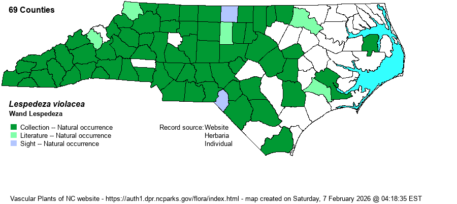 | Other Common Name(s) | Wand Bush-clover. Violet Bush-clover or Violet Lespedeza are now incorrect, as the former L. violacea is now L. frutescens, and that is the name to use for it. The "new" violacea is a rather unbranched species as should no longer have any name referring to violet. | |