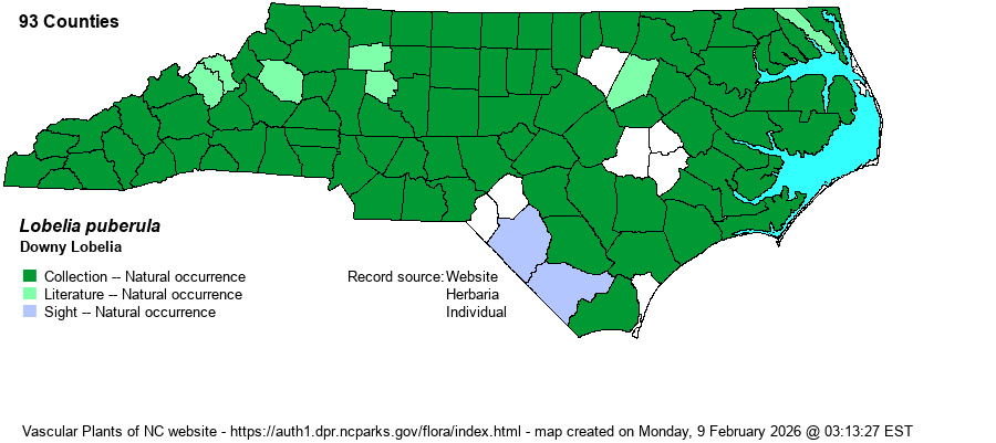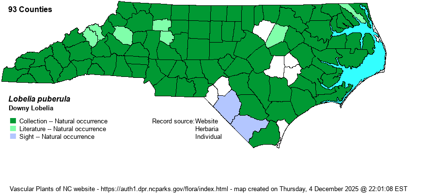 | Identification | This is a fairly standard Lobelia, being an erect herb, usually unbranched, and reaching about 2 feet tall. The stem is usually quite pubescent, especially toward the base. The numerous alternate stem leaves are sessile, elliptic to oblanceolate and rounded toward the tip, about 3 inches long and 1-inch wide, only gradually smaller up the stem. The top 6-8 inches of the stem is the narrow raceme, of crowded flowers, each violet-blue to medium blue, and about 3/4-inch long. The raceme is often somewhat secund or slightly twining, but is not dense on all sides of the stem as is L. siphilitica. Though many other species in the genus have similar appearances, all others tend to be essentially smooth on the stem and leaves; but this species has hairy leaves and well as stems. As it occurs statewide, it should be very familiar to all biologists, and this is the "default" tall blue-flowered Lobelia, unless or until proven otherwise as L. elongata, L. georgiana, L. amoena, L. glandulosa, etc. | |