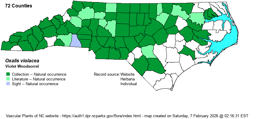 | Identification | This is the only native rose-purple-flowered Oxalis, being confusable only with the exotic O. auriculata. This is a colonial species, often in fairly dense patches. The stem/leaves grow to only about 3-4 inches tall, with the flowering stalks extending above the leaves to 6-8 inches high. As with other Oxalis species, the leaves are clover-like, with 3 leaflets on long petioles. The flowers have 5 rose-purple petals, and a flower spread of about 1-inch across. When not in bloom, the species could be confused with a few yellow-flowered species, though the leaves of O. violacea are often (but not always) purple on the dorsal surface. This species has smooth flowering stalks, whereas the exotic species (O. articulata) has pubescent stalks. The exotic species also has sepals strongly pubescent as opposed to essentially glabrous in O. violacea. O. articulata, as expected of an exotic species, is the one commonly seen in gardens, lawns, and along roadsides, almost always in full sun. | |