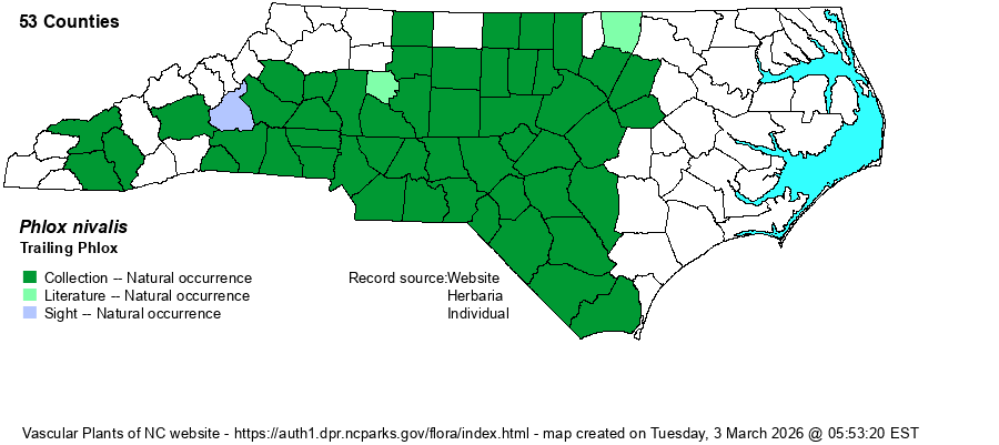 | Identification | This is a unique Phlox for the Piedmont and Coastal Plain, being evergreen, semi-woody (suffruticose), and a sprawling plant that sends up erect but deciduous flowering shoots to 2-5 inches high. It has needle-like leaves, usually several in a whorl, with numerous whorls, and thus the plant is quite like a "dwarf cedar". These leaves are barely 1/3-inch long and are very crowded on the plant. At the end of each stem grow a few flowers, each a typical rose to pink in color with the long tube and 5 flaring lobes, about 1-inch across. In this species, the lobes are slightly notched to squared off at the apex, with red dots at the bases of the lobes. When in bloom, the species is unmistakable, but a few other plants of dry roadbanks, edges, and sandhills do look somewhat similar in vegetative form -- Pine-barren Sandwort (Mononeuria caroliniana), Sandhill St. John's-wort (Hypericum lloydii), and Atlantic St. John's-wort (H. tenuifolium). When in bloom, this is a familiar and often seen pink-flowered spring wildflower of dry places. | |