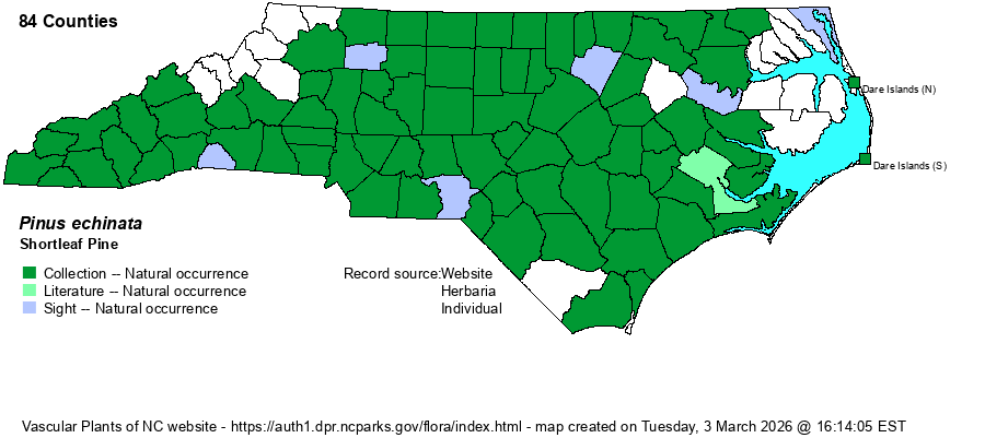 | Distribution | The only pine with a nearly statewide range, found throughout the Piedmont, nearly throughout the Coastal Plain (but scarce to locally absent in far eastern counties), and over the central and southern Mountains. It seems to be absent in the northern montane counties, north of Buncombe County. Known locally from Outer Banks maritime forests at Kitty Hawk Woods, Nags Head Woods, and Buxton Woods.