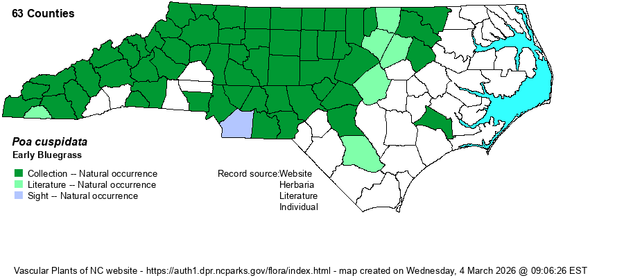 | Identification | These plants are perennial and 1-2 feet tall, growing from horizontal rhizomes (unlike most of out native bluegrasses, which lack rhizomes). Like some other NC Poa species, the inflorescences are composed of well-spaced whorls, but in this case only 2 (-3) branches per whorl. Spikelets occur near the ends of the branches and lemmas have a tuft or web of hairs at the base. This is a welcome companion on spring wildflower walks. | |