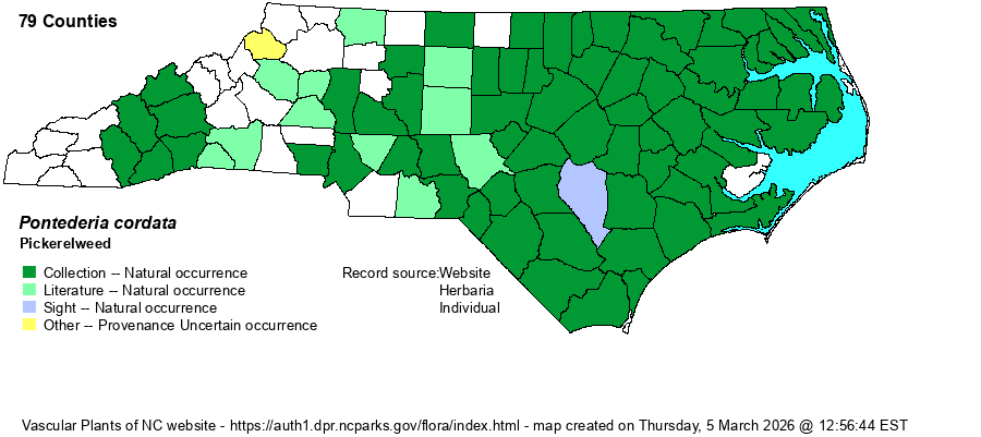 | Distribution | While the extremes of this species are certainly different in leaf shape, there is a complete series linking the extremes as viewed in eastern North America. Therefore, P. cordata var. lancifolia is not recognized here by the website editors, despite it being listed by Weakley (2022). The full species occurs throughout the Coastal Plain and the eastern parts of the Piedmont. It is spotty in occurrence in the western and central Piedmont. However, this species is perhaps planted by staff at some parks in the state at man-made lakes and ponds, and the "increase" in western Piedmont records as seen by iNaturalist photos may be somewhat of an un-natural spread. It may be legitimately absent in the northern Mountains, at least as a native species.