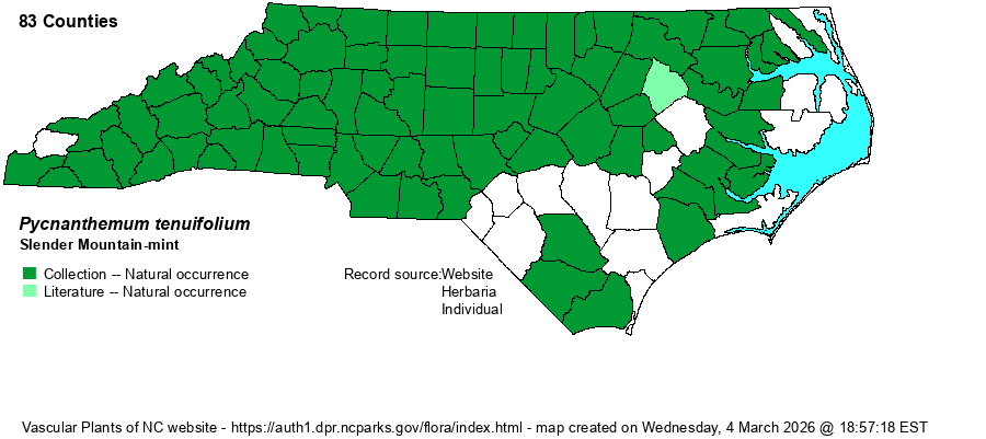 | Abundance | Common in the Mountains, common to very common in the Piedmont, and fairly common to locally common in much of the northern and central Coastal Plain. Scarce to absent in the far northeastern and parts of the southern Coastal Plain. This is the most abundant Pycnanthemum species in NC. | |