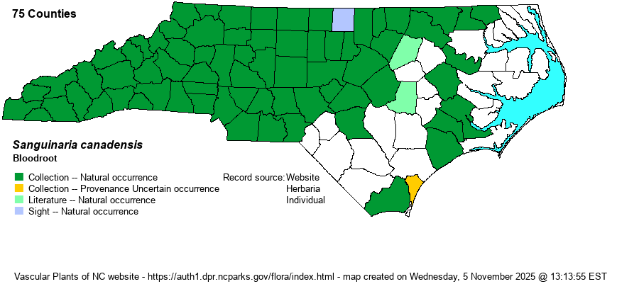 | Distribution | Throughout the Mountains and Piedmont, with records for all counties. Scattered over most of the western and central Coastal Plain, but absent in the far eastern counties and mostly absent in some southern counties.