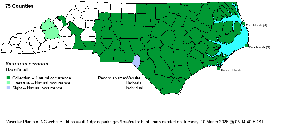 | Distribution | Found across the entire Coastal Plain and most of the Piedmont, but of spotty occurrence in the westernmost counties near the foothills; only a few records for the Mountains.