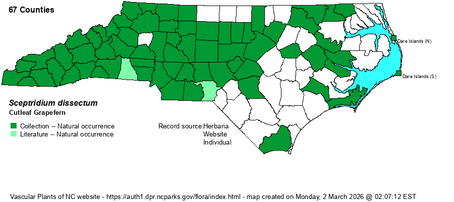 | Taxonomic Comments | This species was formerly named as Botrychium dissectum. Many references list varieties of this species, though Weakley (2018) only considers the obliquum taxon and the dissectum taxon as forms and not as varieties.