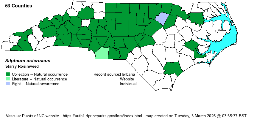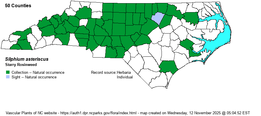 | Distribution | Mostly the Piedmont, and in the central and southern Mountains; disjunct to the outer Coastal Plain: Craven Co., "roadside, US 70, Dover" in 1966; and Pender Co., "causeway across swamp forest, Northeast Cape Fear River near Rocky Point" in 1950.