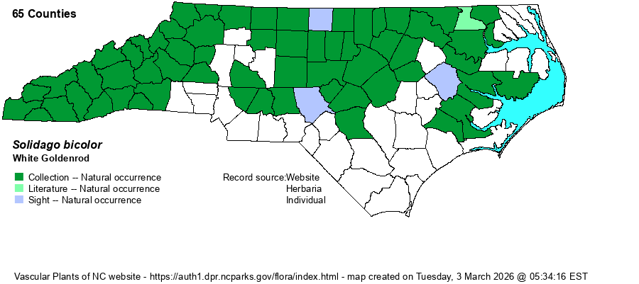 | Identification | White Goldenrod and White Prairie Goldenrod (S. ptarmicoides) are our only goldenrods with white ray florets. White Prairie Goldenrod has linear and untoothed leaves, whereas White Goldenrod has lance-shaped to elliptic and toothed leaves. Much more similar, when not in flower, is Slender Goldenrod (S. erecta), but it has smooth stems (vs. hairy at least basally in S. bicolor). This is a familiar plant to most biologists, and the creamy white to dull white (not bright white) flowering spike is quite distinctive. | |