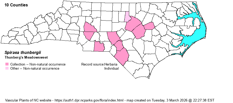 | Distribution | Distributed from Rowan County in central Piedmont eastward to Wilson and Robeson counties in the Coastal Plain. Specimens from Buncombe, Durham, Guilford, Jackson, Orange, Pender, and Stanly counties are of cultivated or persisting plants.