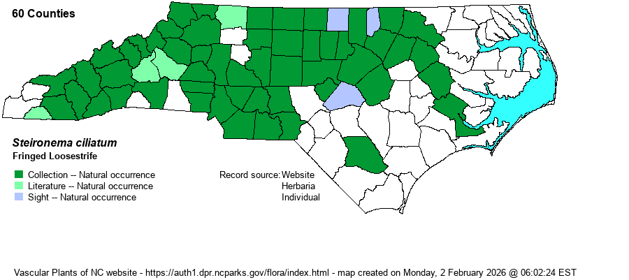 | Taxonomic Comments | Weakley (2020) has split out Steironema from Lysimachia based on a 2018 paper using molecular research; and in so doing has gone back to "old" taxonomy. In Lysimachia there are no staminodes and the leaves are punctate with elongate markings (vs. staminodes present and punctae absent in Steironema). | |