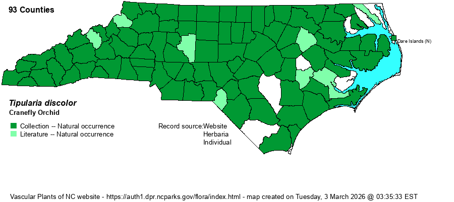 | Abundance | Common to very common across the Mountains and Piedmont. Generally common in the Coastal Plain, though there are numerous counties there without a known record. This is the most numerous and frequently seen orchid in the state. | |