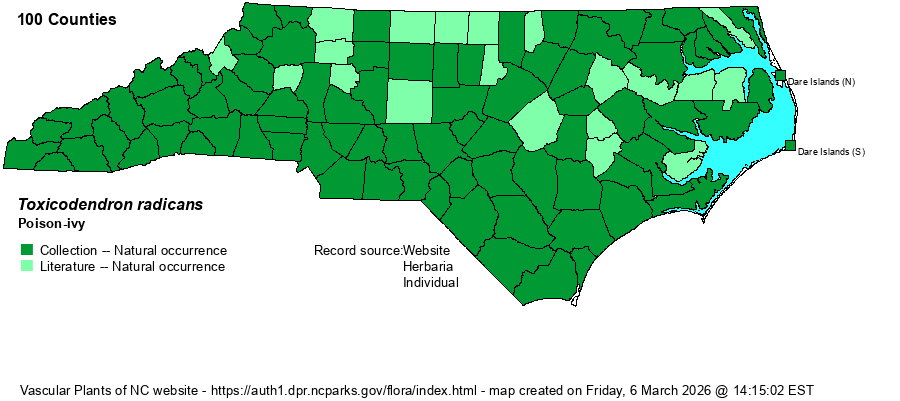 | Taxonomic Comments | Formerly known as Rhus radicans, but this species, along with Poison-oak (T. pubescens) and Poison Sumac (T. vernix), have been moved to the genus Toxicodendron in recent decades. The species has a handful of named varieties, though the one in the state is the nominate one – T. radicans var. radicans. BONAP maps Cumberland County for T. rydbergii, a non-climbing close relative of the North and West, but this record is surely erroneous.