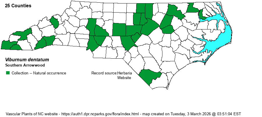 | Distribution | This description here refers to the “strict-sense” V. dentatum, which was the former V. dentatum var. dentatum that occurs in the Coastal Plain and Piedmont. This elevated taxon is believed to occur mainly in the central and eastern Piedmont and the northern Coastal Plain, and sparingly in the Mountains. Its range in much of the Coastal Plain is not well known, as a number of records there actually belong to V. recognitum, which see. Weakley's (2024) province range map shows it as "rare" in the Coastal Plain, "uncommon" in the Piedmont, and "rare" in the Mountains. Most specimens from the Coastal Plain in the SERNEC database seem to have been identified as the recently-split V. recognitum -- the former V. dentatum var. lucidum. Nonetheless, the state range map (below) is likely quite incomplete. Records for a few central Mountain counties need to be re-evaluated versus V. carolinianum. Note that -- as most herbaria have not renamed their Viburnum dentatum specimens -- the website editors only used labels with V. dentatum var. dentatum to map the species, as only V. dentatum could refer to several of these elevated species.