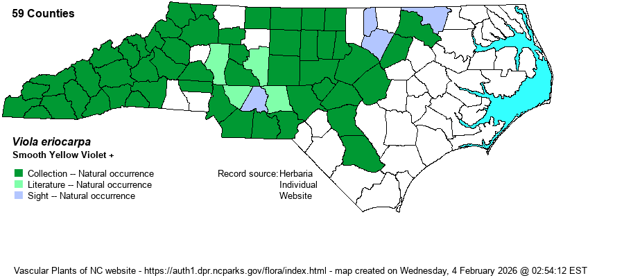 | Distribution | The taxonomy of Viola eriocarpa and V. pubescens, which have each gone by several names depending on the authority/reference, used to be muddled. Now, however, the current names used by this website are considered to be accurate. Weakley (2018) considers V. pubescens to be the more geographically restricted of the two in NC and is limited mainly to the mountains and foothills. He considers V. eriocarpa to be widespread across the Mountains and Piedmont, and into the western edge of the Coastal Plain (floodplain of Cape Fear River south to Bladen County). As can be seen from the map, the range into the Coastal Plain extends only along a few brownwater rivers (Roanoke and Cape Fear).