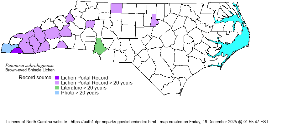 Pannaria subrubiginosa Brodo & McMullin - Brown-eyed Shingle Lichen