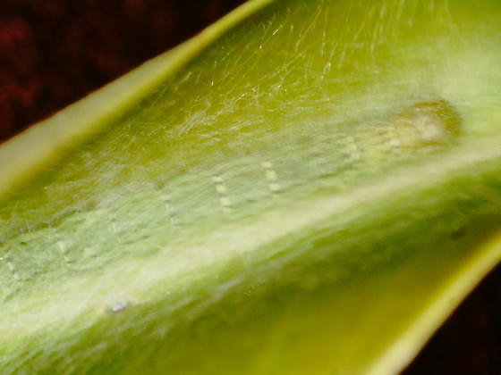 ). The larva fed by skeletonized the leaf along the midrib and had an amber-colored head and prothoracic shield, a light greenish abdomen with a series of irregular, fine, longitudinal lines, and a transverse row of white dots along each abdominal segment. A recent iNat record (2025; Ashley Bosarge) also shows a larva beneath a silt shelter that was feeding on a