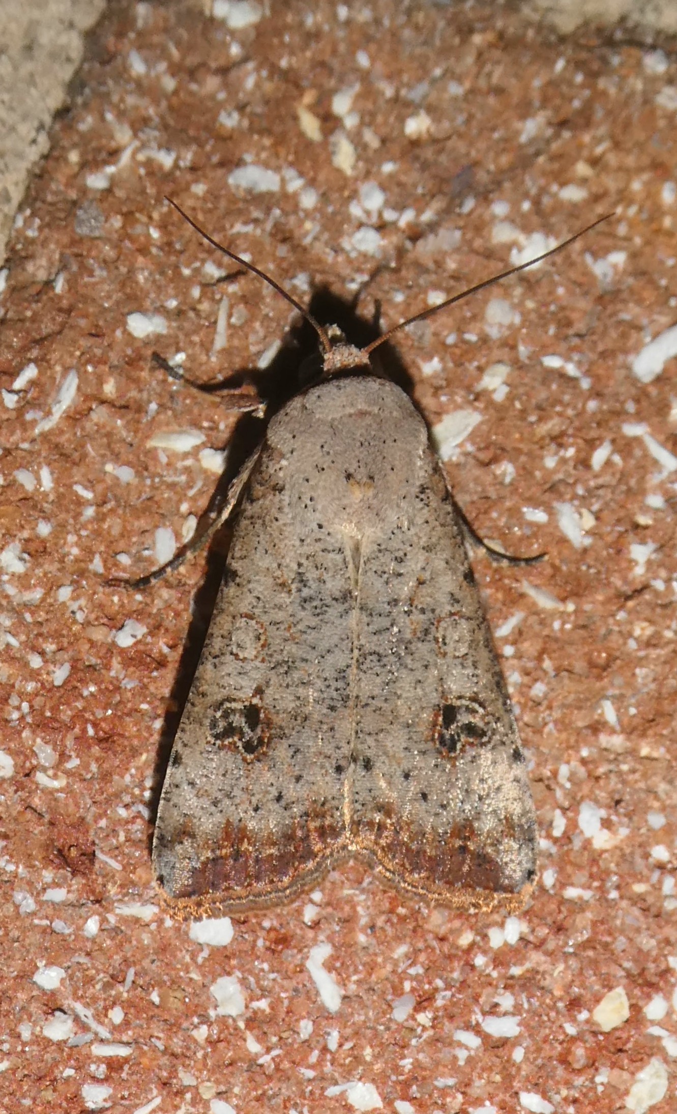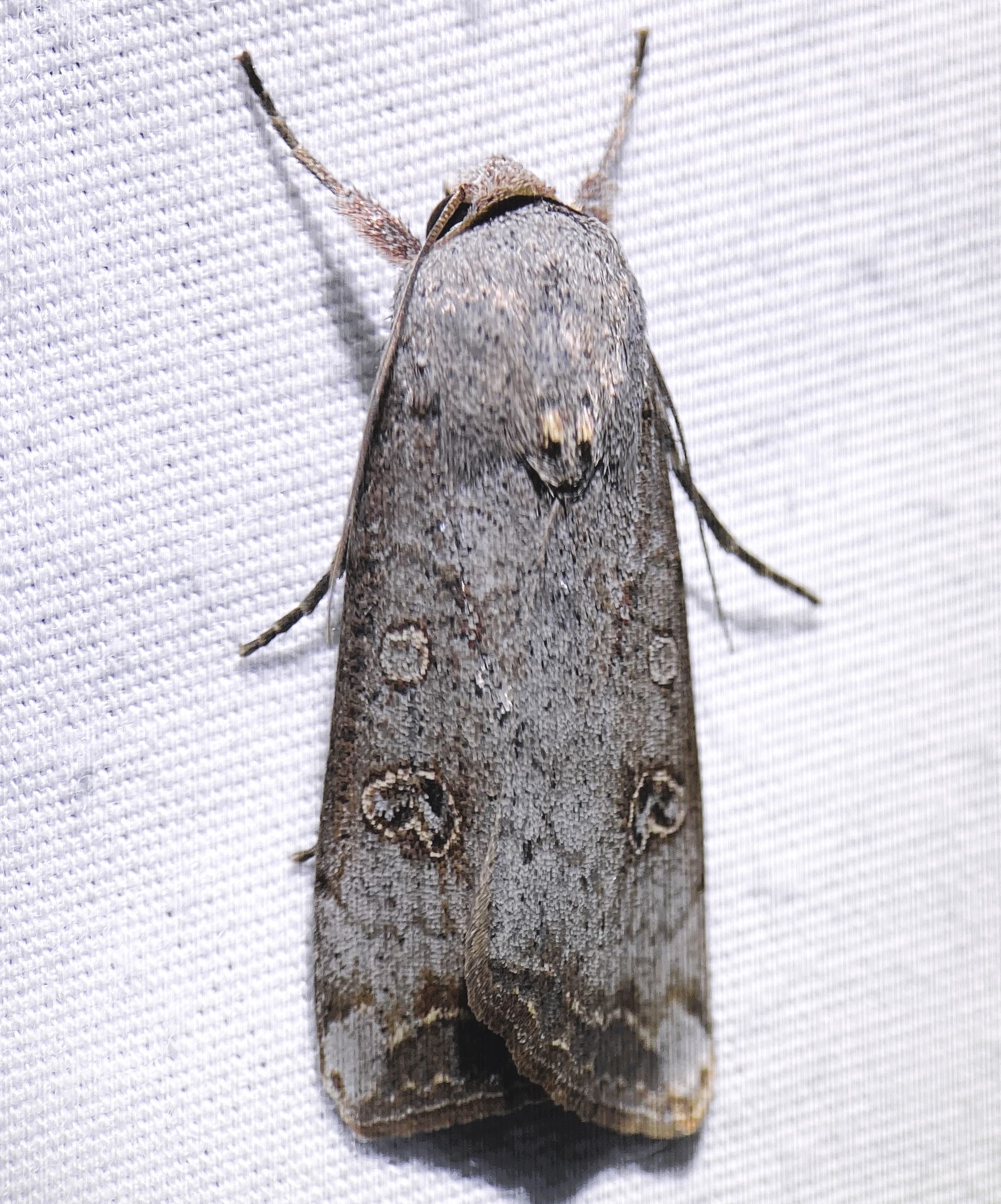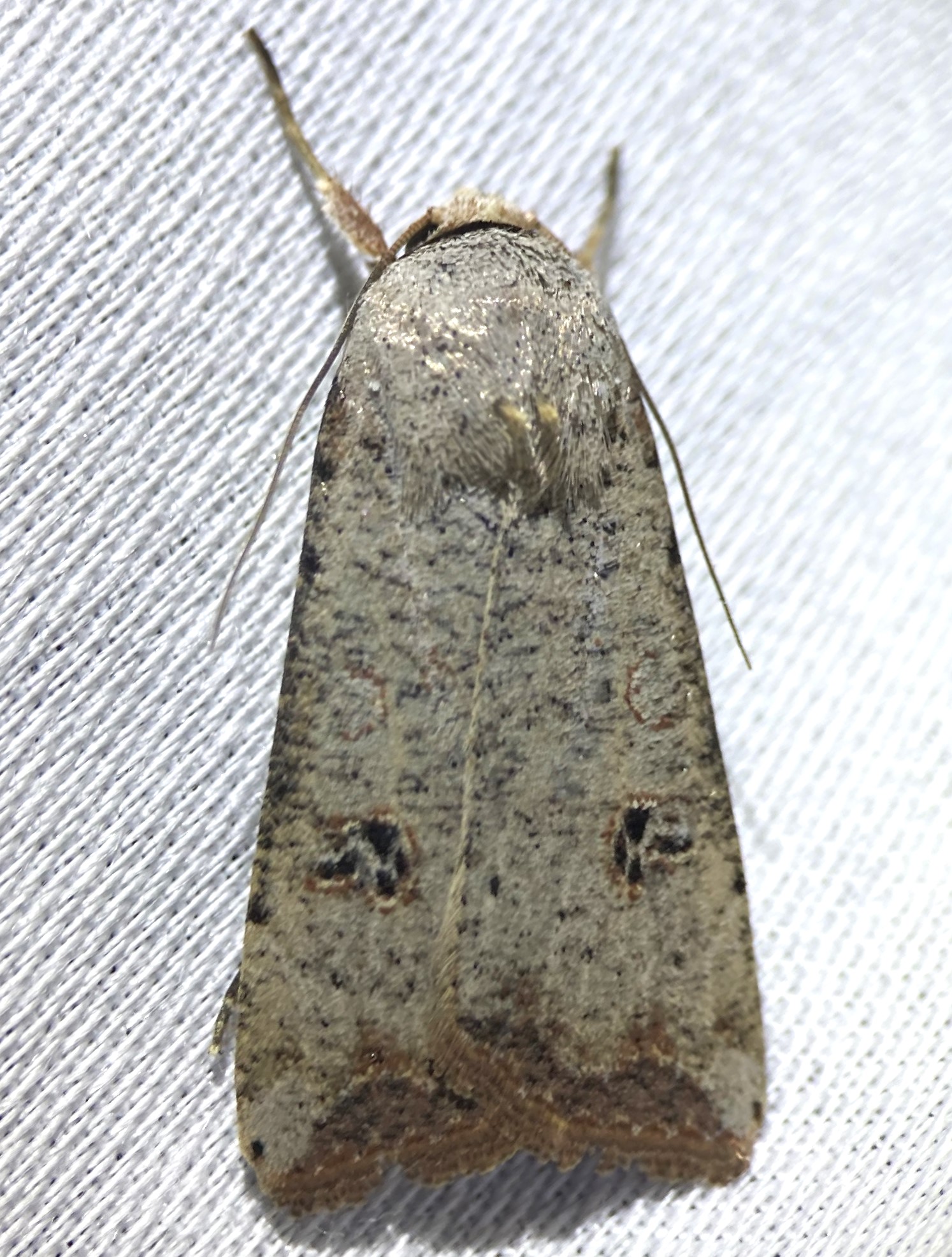 Adult Markings: The ground color of the wings and thorax is light to medium gray. The collar has a black crescent but the thorax is otherwise unmarked. The orbicular is outlined with reddish brown and filled with gray or is sometimes obsolete. The reniform consists of several dark dots surrounded by a reddish outline (Forbes, 1954). The hindwings are translucent white, with a brown border and veins. Anicla lubricans and sullivani are similar but usually have smaller reniform spots, consisting of a double, dull blackish shade.