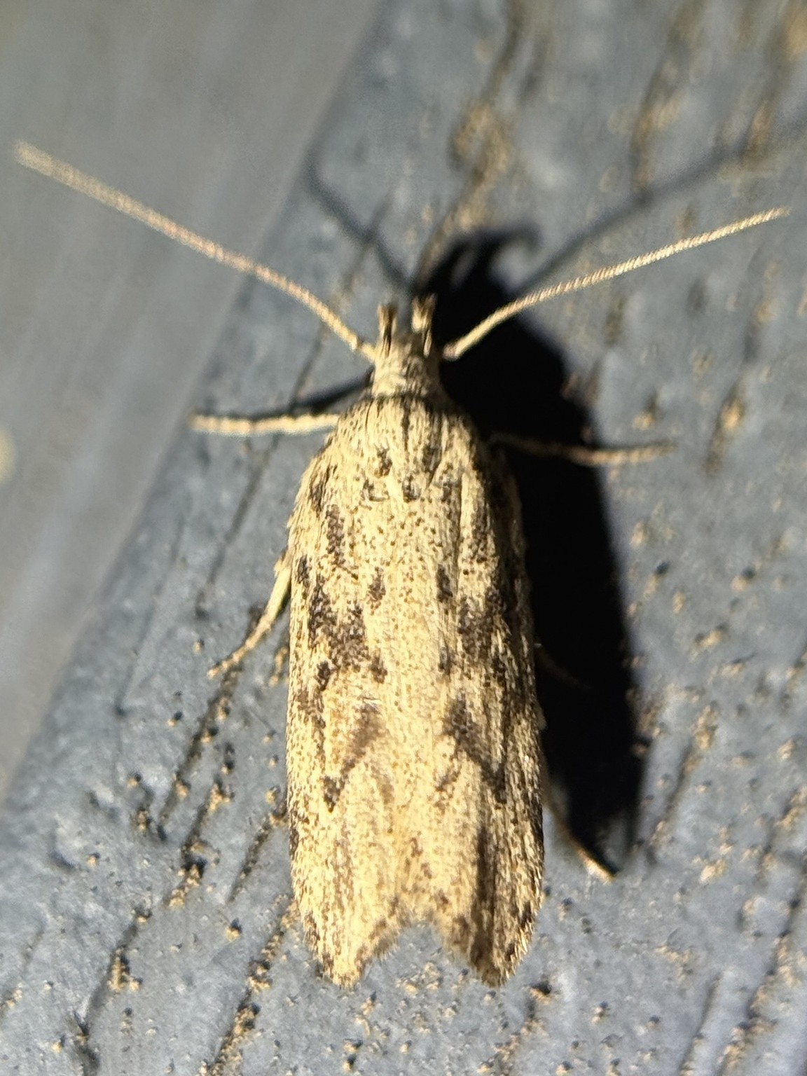 The following is based in part on the description by Murtfeldt (1881) and Hayden et al. (2013). The ground color of the head, body and forewings is pale buff to yellowish white, with ocherous to dark gray shadings and a sparse dusting of blackish scales. The labial palp extends beyond the vertex. The second joint is thickened but smooth, and the terminal joint has two broad dusky bands. The forewing has numerous and rather poorly defined dark spots or blotches that produce a somewhat mottled appearance. These tend to be arranged in narrow, inconspicuous longitudinal rows. The region along the dorsal margin has less dark coloration than the remainder of the wing, and a series of 7-10 dark spots are present around the wing tip. The hindwing is grayish yellow or light gray, with a sub-rectangular, rounded apex. The fringe has long hairs that are paler than the wing proper. The abdomen has dense, white scales at the base of the dorsal surface of the first segment and yellowish orange scales on the dorsal surfaces of the first three segments. The legs are pale with darker banding, and the tibia of the hind leg is densely tufted.