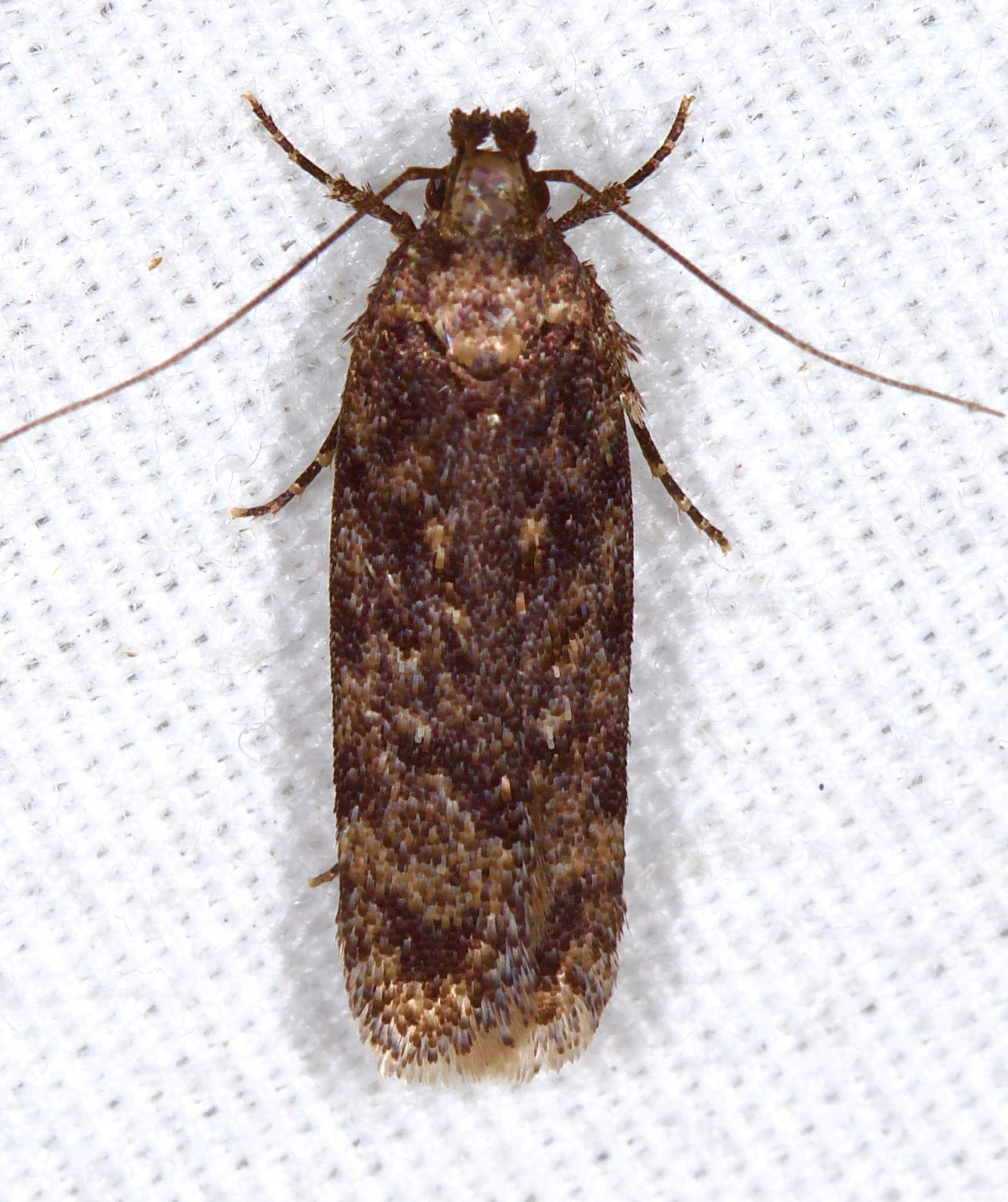 The following description is based in part on that of Hodges (1999). The head and thorax vary from orangish gray to dark gray, and the antenna is dark grayish brown. The lateral surface of the first segment of the labial palp is mainly off-white, while the second segment is mottled with very dark gray, off-white, orange gray, and grayish scales. The third segment is mainly very dark to grayish brown, with the base and apex white to yellowish white. The forewing is rather drab, with a light brown to orangish brown ground color that is overlain with darker spots or blotches. Specimens often have three small and equally-spaced blackish blotches along the costa at about one-third, one-half, and two-thirds the wing length, along with dark dusting on the apical fifth. A thin line of dark scales is often present at the wing base. Two or three black spots are often present below the inner margin at one-third to one-half the wing length that frequently have a few pale to whitish scales on their edges. A posteriorly oblique, irregular stria that is dark grayish brown to blackish is sometimes present that extends from the costa at about one-fourth the wing length. It ends before reaching the inner margin. The hindwing and fringe are light brown to grayish brown. The dorsal surface of the abdomen has the individual terga medium gray basally, and yellowish-white to off-white on the posterior margins. The lateral margins are uniformly shining yellowish white, and the scale tuft on tergum 8 of the male is yellowish gray. The foreleg is mottled dark grayish brown and yellowish white to off-white, with darker tarsi that have pale annulations. The other legs are similar, but paler. This species is one of several rather drab