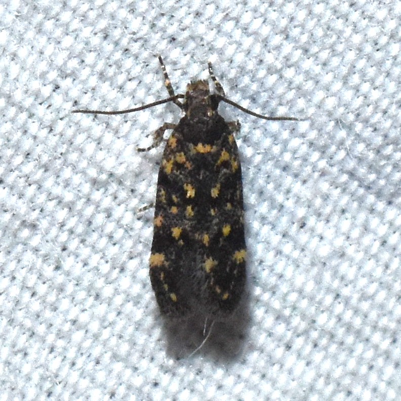 The head and thorax are brownish to dark gray and similar to the ground color of the forewing. The antenna has alternating pale and blackish or fuscous bands. The second segment and base of third segment of the labial palp is mainly off-white, while much of the third segment except the extreme tip is heavily dusted with fuscous to blackish scales. The forewing has a grainy brownish to dark gray ground color that is overlain with darker blotches and pale-yellow to pale-orange spots. A small pale spot is usually present at the base of inner margin and immediately posterior to the thorax when the wings are folded. A pale costal spot is present at four-fifths the wing length that adjoins a darker spot anteriorly. The pale spot often has a matching pale dorsal spot, and the two are sometimes connected by a thin pale line to create a complete fascia at four-fifths. A dark, oblique band or blotch is usually present that begins on the costa at about two-fifths and slants posteriorly before terminating just before the inner margin. This is sometimes represented as an irregular blotch or series of two or three smaller blotches. A series of small pale-yellow or pale-orange spots or scales, along with larger dark blotches, are usually present in addition to the marks described above. Hodges (1999) noted that at least part of the wing has scales with dark-colored scale bases. The legs have alternating pale and blackish bands, with pale scale tufts.