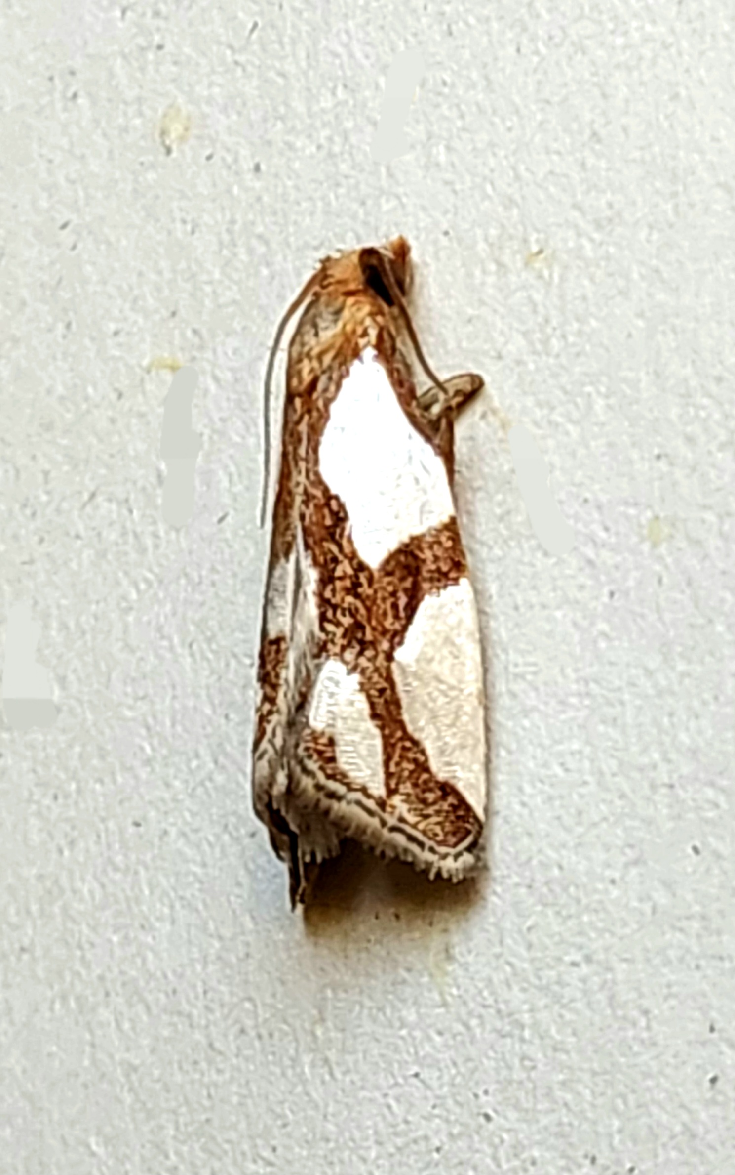 with a distinctive patterning. The head, palps, antennae, thorax, and legs are a rich reddish-brown and are concolorous with an X-shaped mark on the forewing. The forewing is divided into four white patches by a reddish-brown X-shaped mark. The mark is comprised of a transverse band from the mid-costa to the tornus, along with a second band that extends from the inner margin at the base to the mid-wing, then diagonally from there to the apex (Wright and Gilligan, 2017). A thin line of reddish-brown is usually present along the termen and as a short streak along the costa at the wing base. The hindwing is light brown with a paler fringe.