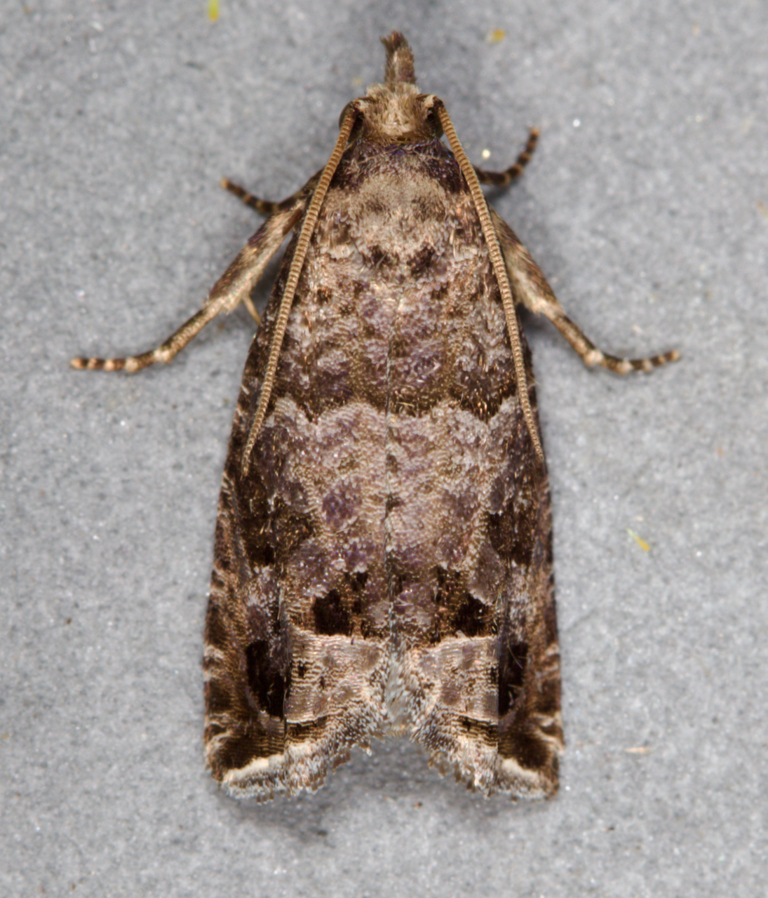 The ground color of the forewing is light brown to blackish brown and is overlain with dark brown fasciae. they are thinly edged with white and usually contrast with the paler interfascial areas. A subbasal fascia is present that is chevron-shaped, nearly complete, and often weakly interrupted by paler scaling. The median fascia is complete and forms a wide band that is outwardly oblique from the mid-costa to the pre-tornal portion of the inner margin. A narrow postmedian band is also present that extends from the costa to the mid-termen and is often constricted or interrupted on the radius. The ocellus varies from being well-defined to obscure and has lustrous gray bars on the proximal, distal, and posterior margins. The central field of the ocellus is concolorous with the interfasial areas and crossed by up to four black dashes. The distal one-half of the costa has inconspicuous paired whitish strigulae and associated lustrous gray striae. The termen has a thin white line from M2 to the apex that is followed distally by a band of white-tipped, blackish-gray scales from the tornus to the apex. Both the fringe of the forewing and the entire hindwing are grayish brown.