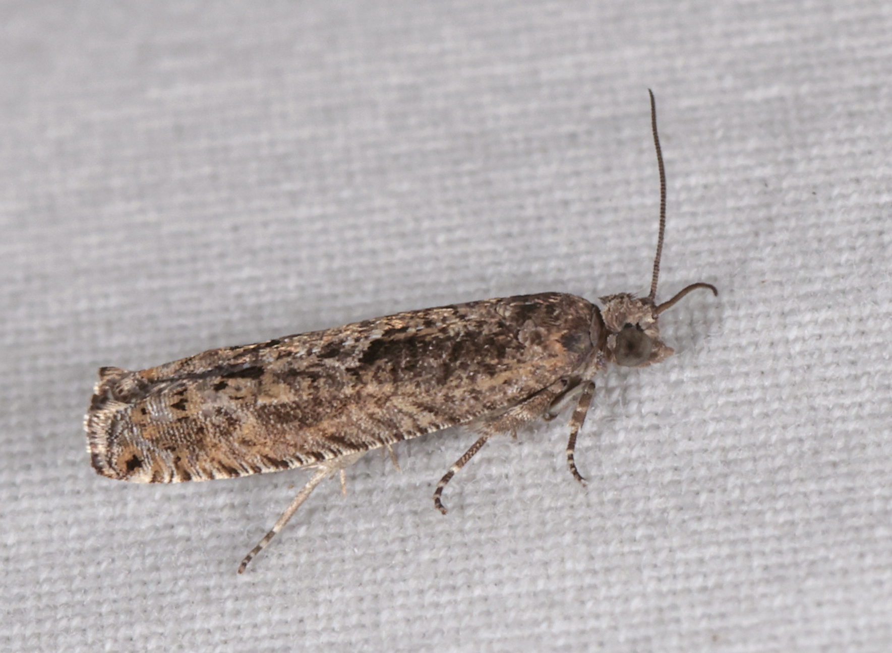 The following description is based primarily on that by Freeman (1942). The adults are sexually dimorphic with the females being more strongly marked than the males. In the males the external surfaces of the palps, and the antenna, head, and thorax are all grayish-brown. The forewing lacks strong patterning and tends to be concolorous with the remainder of the body. The basal region often tends towards dark grayish brown with an admixture of golden brown scales. Golden brown scales also tend to predominate along the posterior margin and in the apical third where the golden brown often contains a few black scales in the tornal region. The fringe is gray and darker apically. The hindwing is light smoky with a paler fringe that has a dark basal line.
