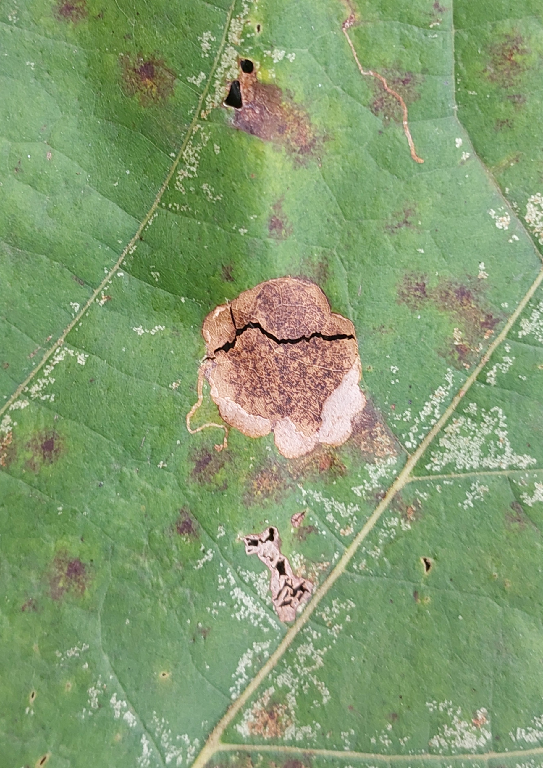 Females lay their eggs on the lower leaf surface, and sometimes near a vein. The pale green larva initially produces a slender, contorted linear track that is usually filled with frass. Several days before pupation, the mine abruptly enlarges into a large rounded blotch that often obliterates the linear portion of the mine (Braun, 1917; Eiseman, 2019). The mature larva emerges from a slit in the leaf and then spins a brown cocoon. Adults from Madison County that Jim Petranka reared were estimated to take around 2-3 weeks to complete the pupal stage, while Ken Kneidel documented a pupal stage that lasted around 18 days at room temperature. Braun (1917) noted that the mines are often abundant on the leaves of American Sycamore (